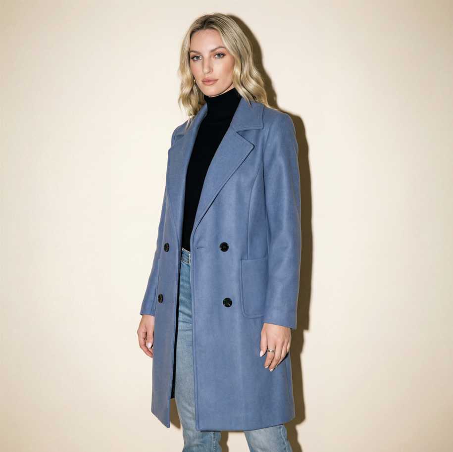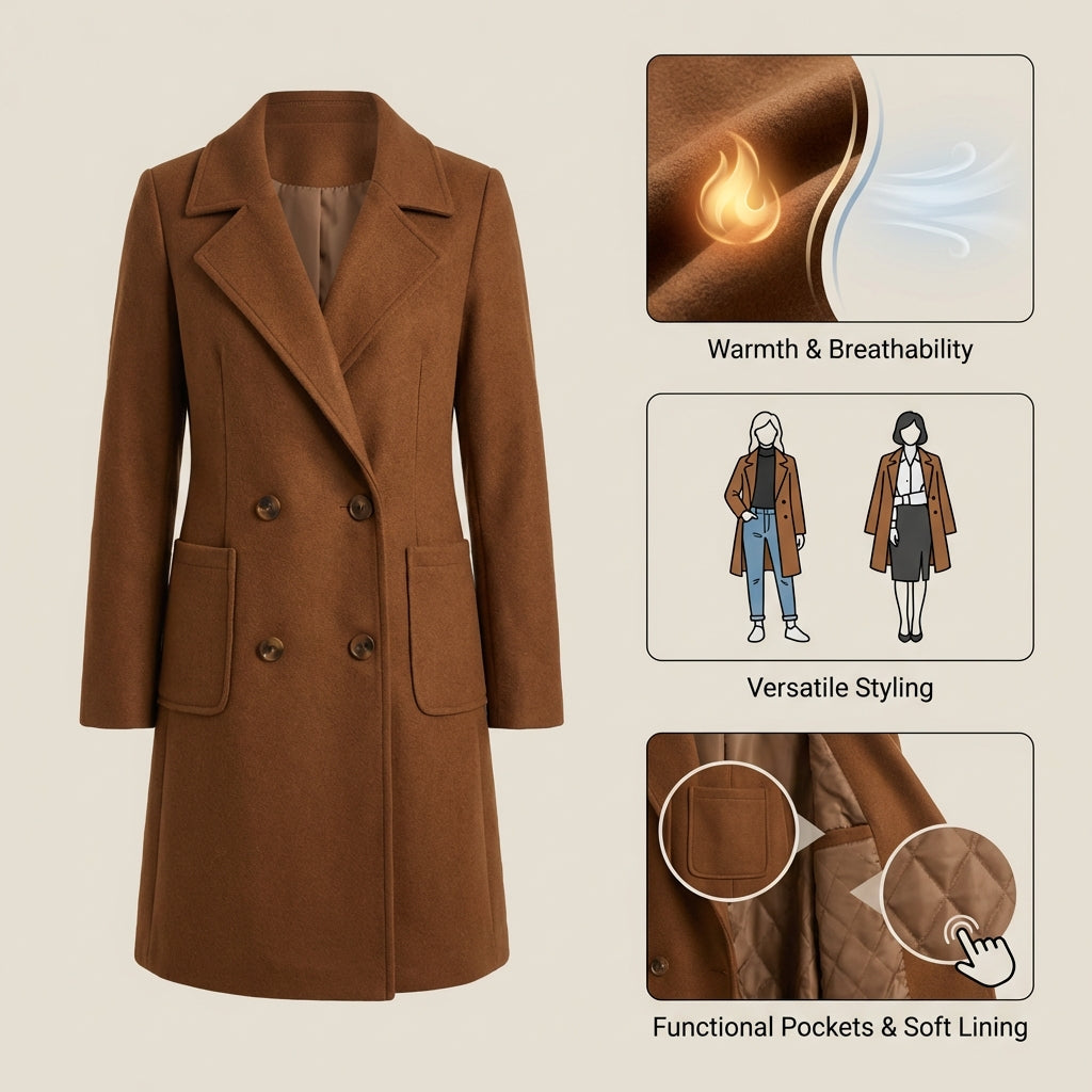 Soft wool-blend fabric delivers warmth and comfort throughout the colder seasons.Elegant mid-length cut creates a flattering silhouette for everyday wear.Timeless tailored design that pairs effortlessly with both casual and dressy looks.Functional side pockets provide convenience without compromising style.Versatile outerwear essential for work, weekends, and winter outings.Durable, easy-care material made to stay beautiful season after season.